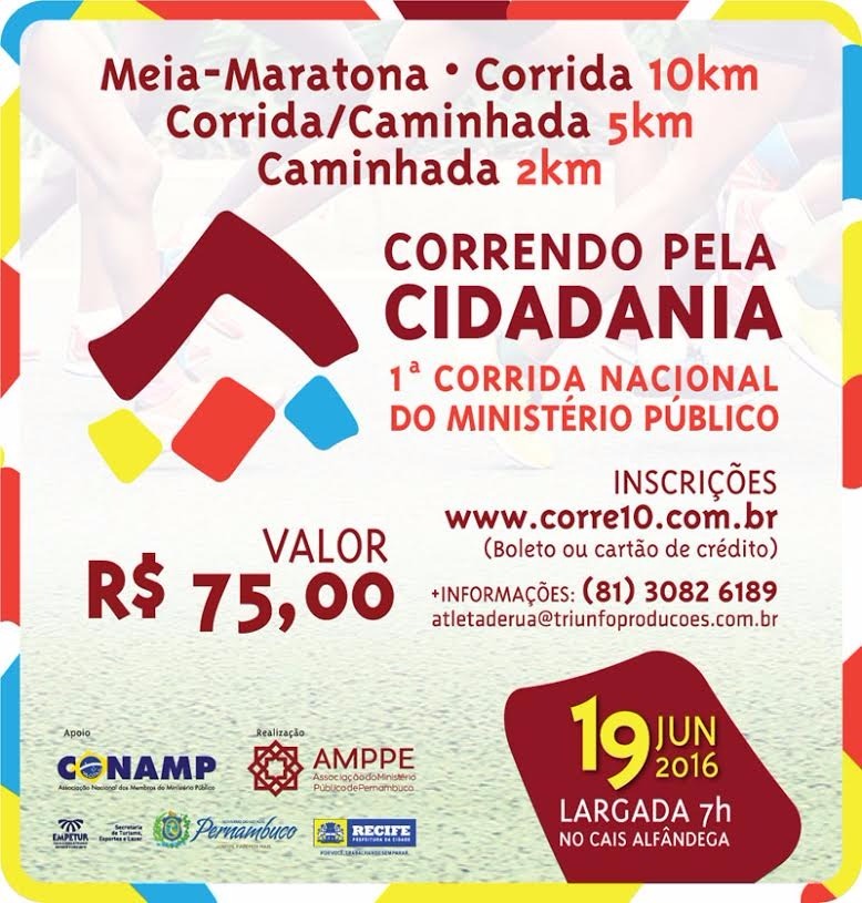 Já estão abertas as inscrições para a 1ª Corrida Nacional do Ministério Público, que será realizada na cidade do Recife, no dia 19 de junho de 2016.  Com o tema “Correndo pela Cidadania”, o evento será promovido pela Associação do Ministério Público de Pernambuco (AMPPE), com o apoio da CONAMP, visando reunir os membros do Ministério Público brasileiro com a sociedade em geral, através da prática esportiva.