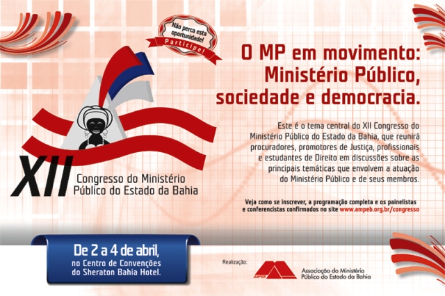 Entre os dias 02 a 04 de abril de 2014, Salvador sediará o XII Congresso do Ministério Público do Estado da Bahia. Promovido pela Associação do Ministério Público da Bahia (Ampeb), o evento será realizado no Centro de Convenções do Sheraton Bahia Hotel.