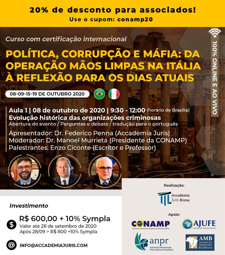 Associados da CONAMP possuem 20% de desconto no curso online internacional “Política, corrupção e Máfia: da operação mãos limpas na Itália à reflexão para os dias atuais”. Para utilizar o desconto, basta aplicar o código de desconto CONAMP20 no momento de compra do curso pelo site. O curso tem o objetivo de colocar em debate, sob um ponto de vista crítico, comparativo e histórico, como a Itália tem enfrentado nos últimos 40 anos esses desafios em favor da cidadania, no paradigma democrático e no contexto institucional.