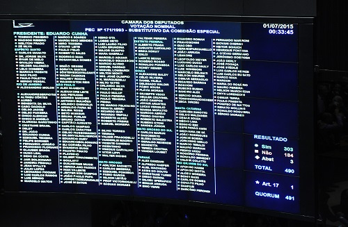 O plenário da Câmara dos Deputados rejeitou, na madrugada desta quarta-feira (1º), o texto da comissão especial para a Proposta de Emenda à Constituição (PEC) 171/93, que reduz a maioridade penal. Foram 303 votos a favor, quando o mínimo necessário eram 308. Foram 184 votos contra e 3 abstenções.