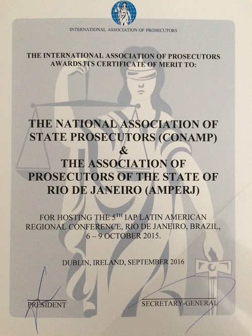 A CONAMP e a Associação do Ministério Público do Estado do Rio de Janeiro (Amperj) receberam homenagem da International Association of Prosecutors (IAP) pela realização da V Conferência Regional da IAP para a América Latina em 2015. O evento foi organizado simultaneamente ao XXI Congresso Nacional do Ministério Público em outubro do ano passado.