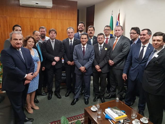 Representantes das entidades que compõem a Frente Associativa da Magistratura e do Ministério Público (FRENTAS) reuniram-se, nesta segunda-feira (13), com o relator da Reforma da Previdência na Comissão Especial, deputado Samuel Moreira (PSDB), e com o 1º vice-presidente da Câmara, Marcos Pereira (PRB). O objetivo do encontro foi a apresentação das emendas, defendidas pelas associações, ao texto da PEC 6/2019 aos parlamentares. O 1º vice-presidente da CONAMP, Manoel Murrieta; o assessor especial da entidade para a reforma, Paulo Penteado, presidente da Associação Paulista do Ministério Público (APMP); e o presidente da Associação do Ministério Público do Distrito Federal e Territórios (AMPDFT), Trajano Sousa, estiveram presentes.