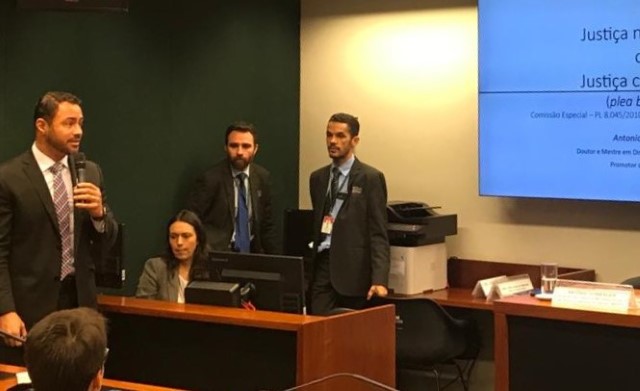 Nesta quinta-feira (24), os promotores de Justiça Antônio Suxberger (DF) e Leonardo Giardin de Souza (RS) participaram de audiência pública sobre o tema "Princípios Fundamentais e Julgamento Antecipado (Plea Bargain)". O 1º vice-presidente da CONAMP, Manoel Murrieta, acompanhou o debate que ocorreu no âmbito da comissão temporária do novo Código De Processo Penal (PL 8045/10).