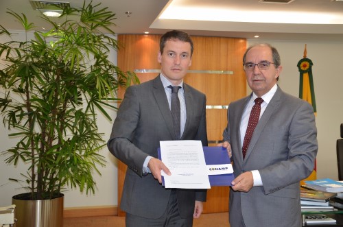 Victor Hugo entregou a Fabiano Dallazen uma solicitação de estudo e posicionamento acerca do PLS 135/18. O projeto de lei, de autoria da Comissão de Direitos Humanos e Legislação Participativa, altera o Decreto-Lei n° 3.689, de 03 de outubro de 1941 (Código de Processo Penal), para prever a “competência” do Ministério Público para investigar crimes cometidos por agentes dos órgãos de segurança pública, no exercício das funções, e para permitir que o ofendido participe efetivamente da investigação criminal. O procurador-geral de Justiça garantiu que levará o tema para discussão no âmbito do CNPG e do Grupo Nacional.