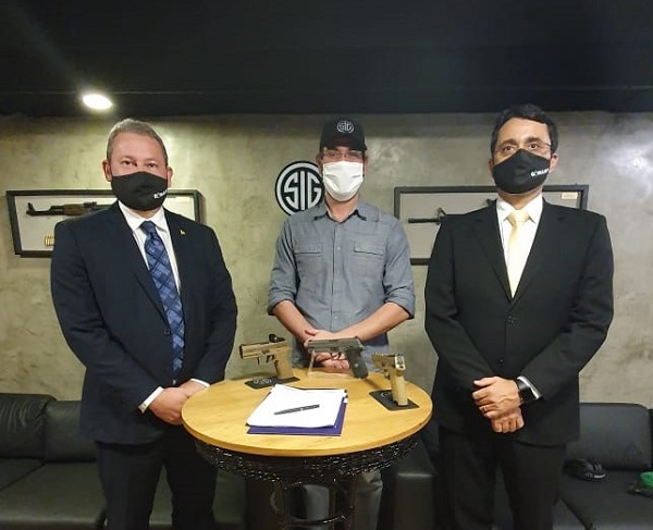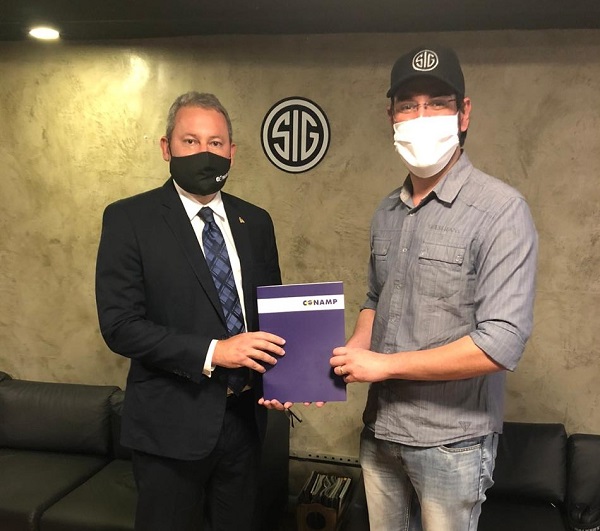 O presidente da CONAMP, Manoel Murrieta, e o 1º vice-presidente da entidade, Tarcísio Bonfim, assinaram, no dia 19 de agosto, convênio com a Sig do Brasil, empresa representante da Sig Sauer no país.
