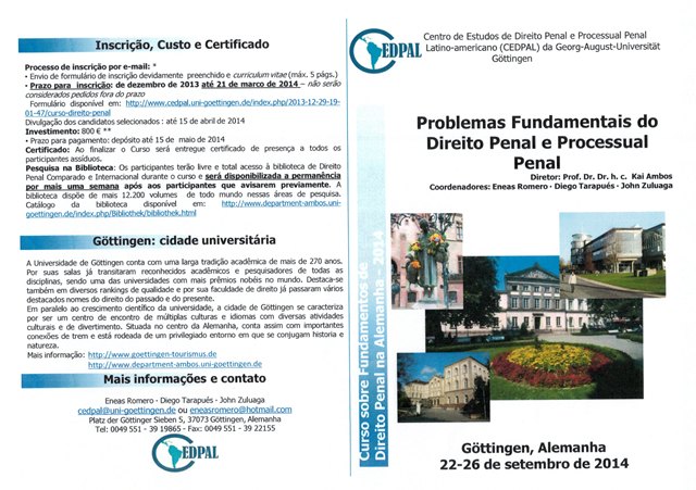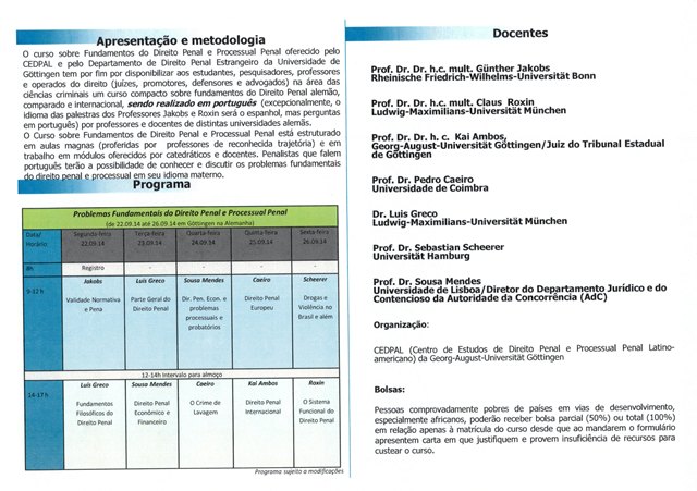 A Universidade de Göttingen, através do Centro de Estudos de Direito Penal e Processual Penal Latino-americano (CEDPAL) da Georg-August-Universität Göttingen, oferece o curso Problemas Fundamentrais do Direito Penal e Processual Penal entre os dias 22 e 26 de setembro deste ano, em Göttingen, Alemanha.